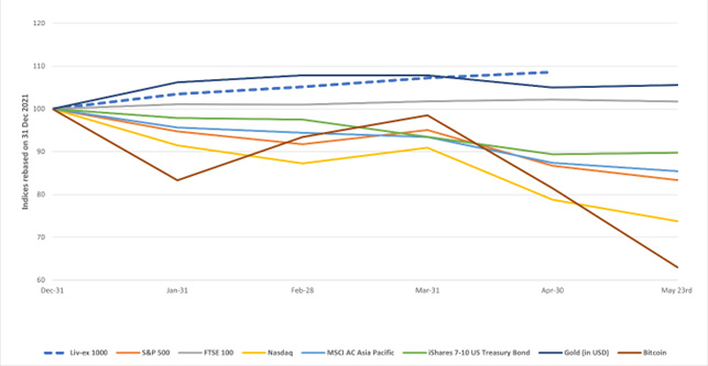 Kigger man på den aktuelle udvikling siden afslutningen af 2021 og frem til sommeren 2022, er det gået voldsomt tilbage for alle ovenstående aktiver (og Bitcoin), mens det er gået anderledes pænt frem for investeringsvine med ca. 10%.